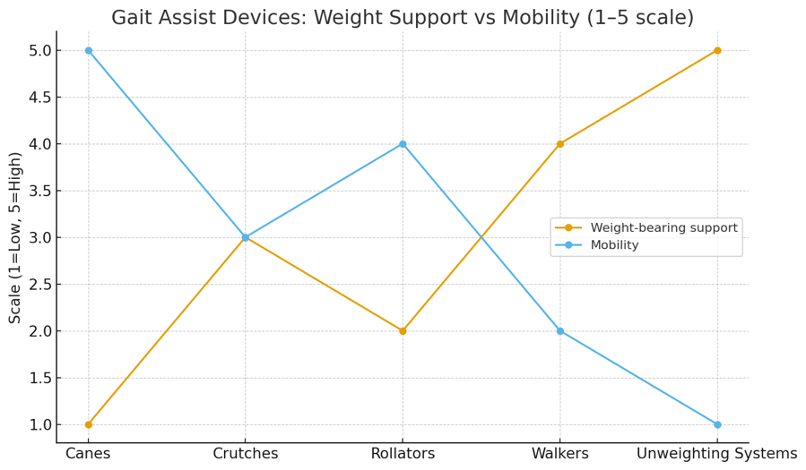 When comparing different gait devices, you want to consider the weight support vs mobility. The following chart visualises the trade‑off between support and mobility across common devices.