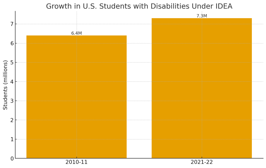 Public K‑12 schools served 7.3 million students with disabilities in the 2021‑22 school year (about 15% of enrollment), up from 6.4 million in 2010‑11. This growth reinforces why investing in adaptive therapy products is essential for compliance and inclusion. See the chart below.