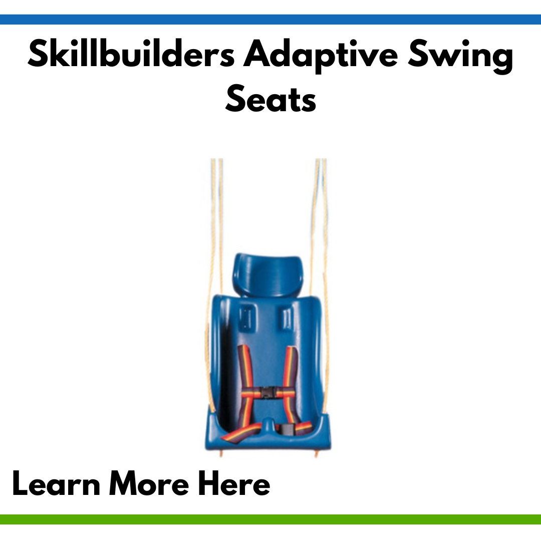 Skillbuilders full‑support swing seats incorporate a built‑in pommel, high back, and harness. Head and leg rest options are available for users who require additional support, and the seats can be hung using chains or ropes. In hospitals, they are used for sensory integration therapy; in schools they promote inclusion on playgrounds and in sensory rooms.