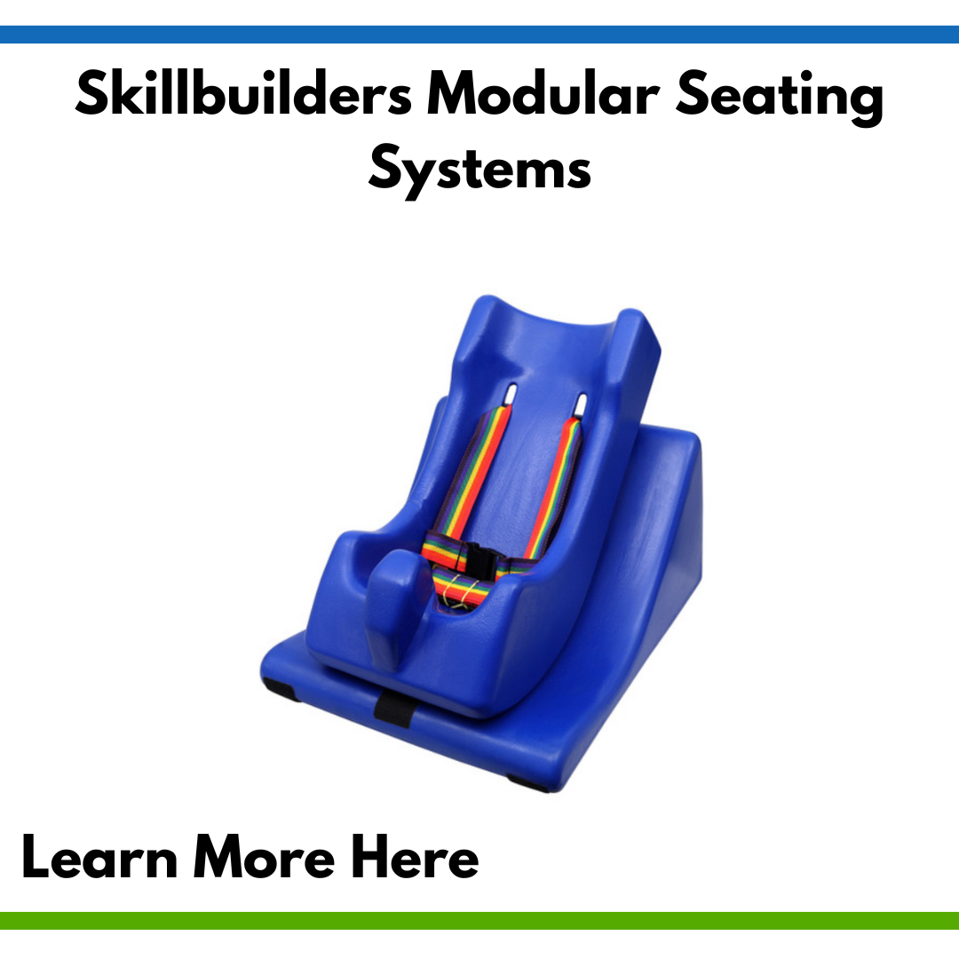 One example of this includes the Skillbuilders Modular Seating Systems. Skillbuilders manufactures modular seating systems designed for pediatric and adult users. The seats provide safety and support to help individuals experience social interaction and inclusion. Key features include a built‑in pommel/leg abductor and contoured interior, safety harnesses, and molded foam construction with a waterproof coating. Configurations include feeder seats, floor sitters, mobile floor sitters and accessories.